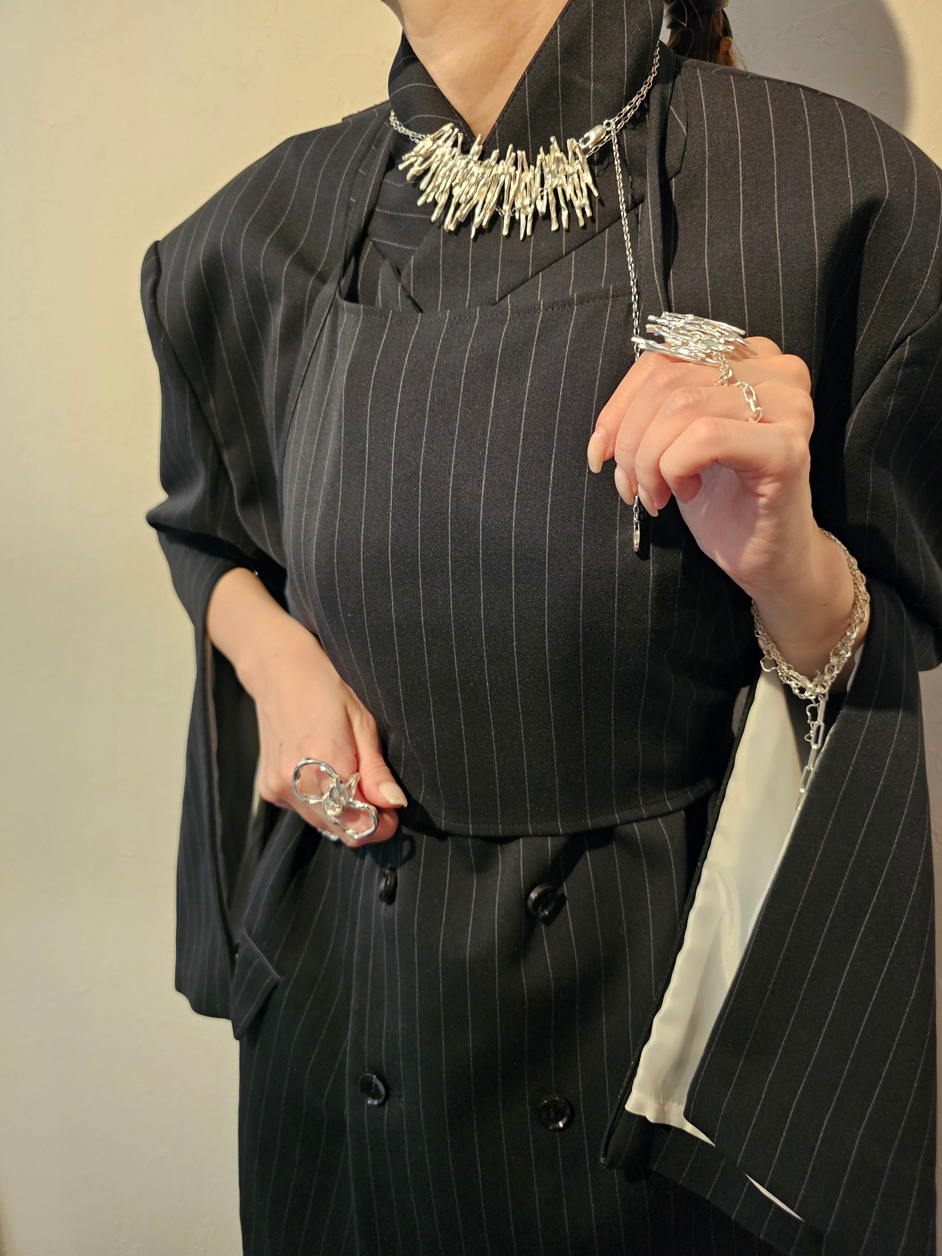 長さ調整を可能にすることで、印象ががらっとかわりスタイリングに変化をもたらしてくれるアイテムです。