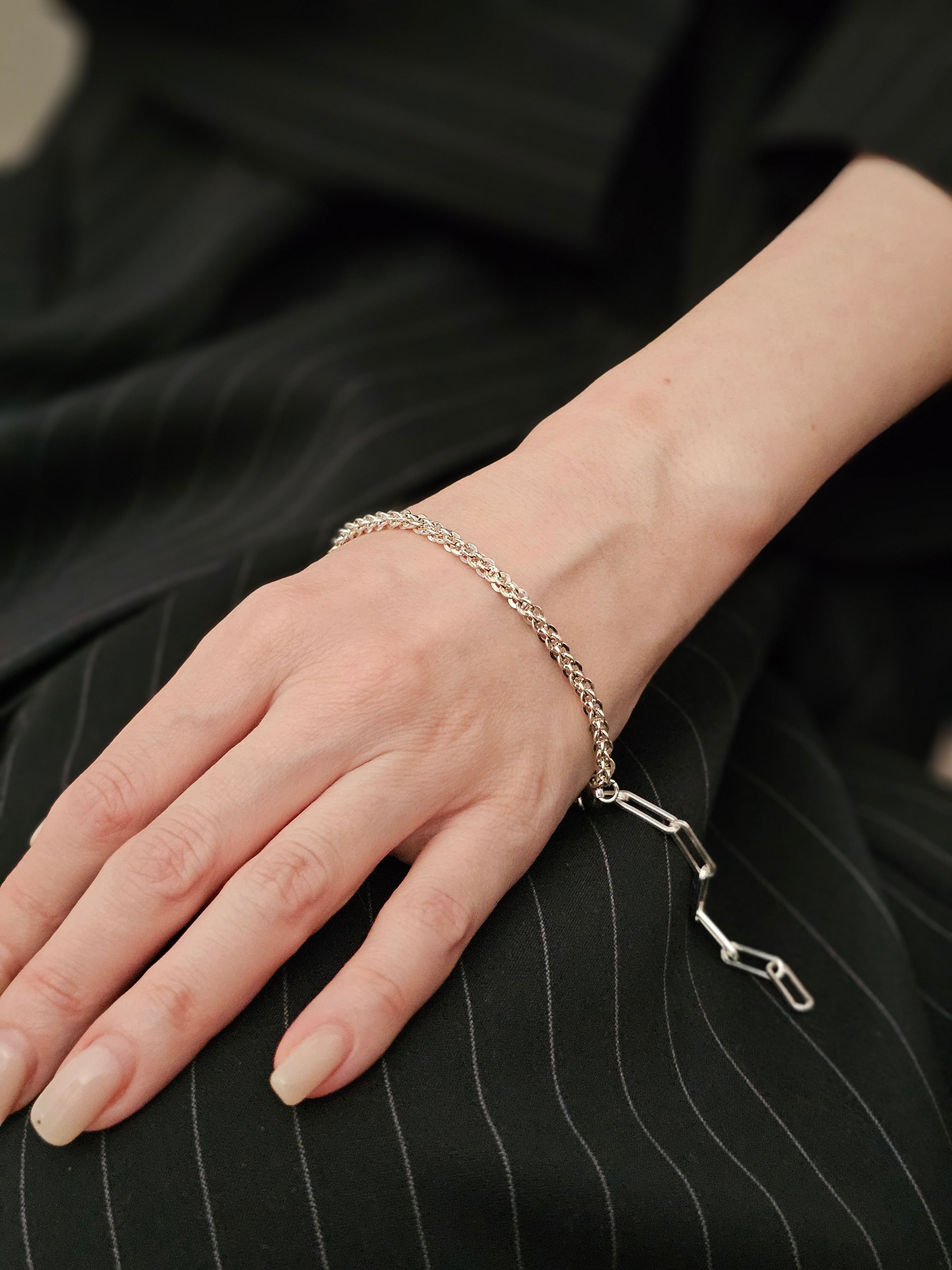 洗練されたチェーンでスタイリッシュに決まるブレスレッドです。