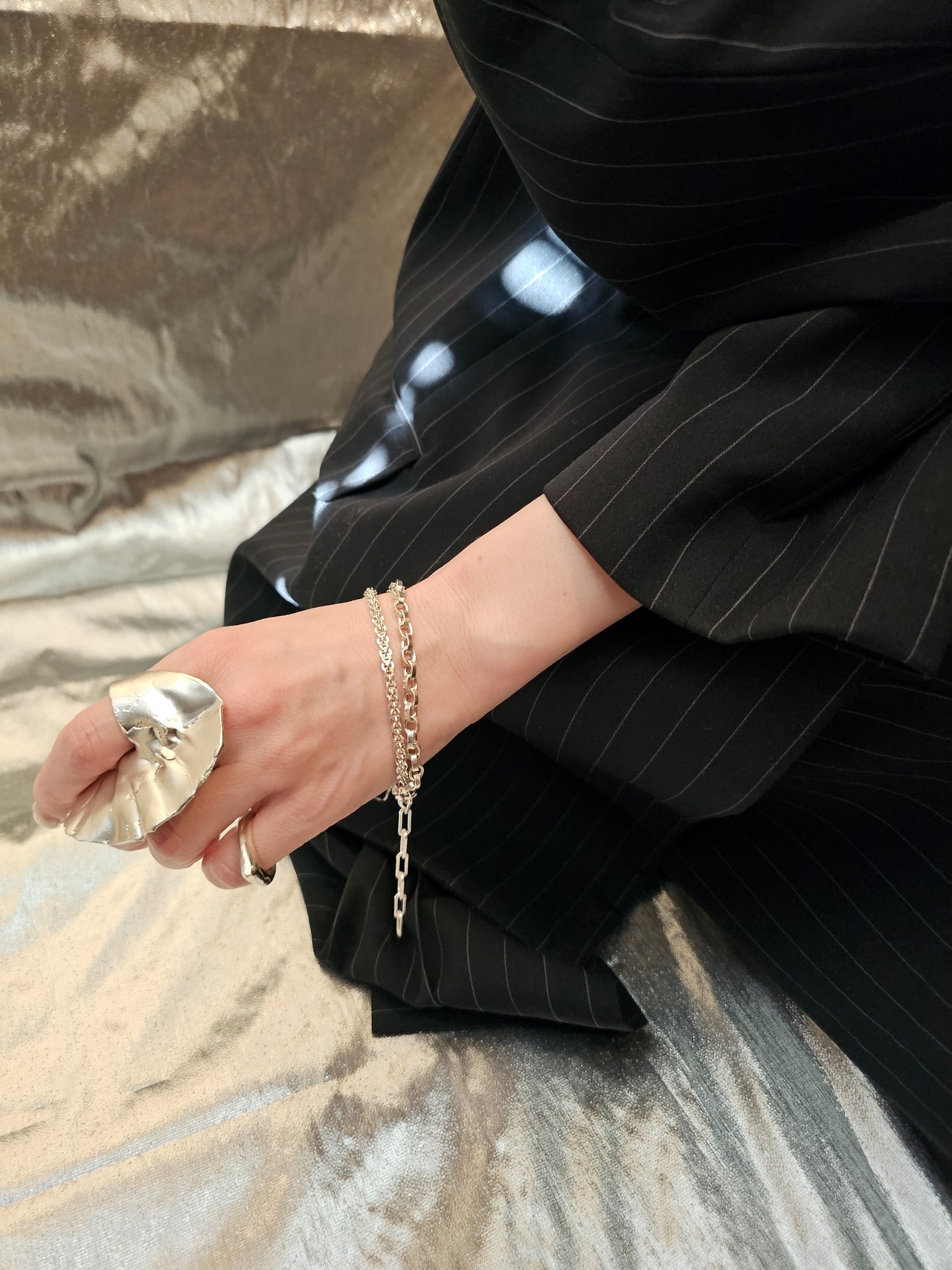 角度によって光るチェーンがポイントとなり、幅広いスタイリングに着けてほしいです。
