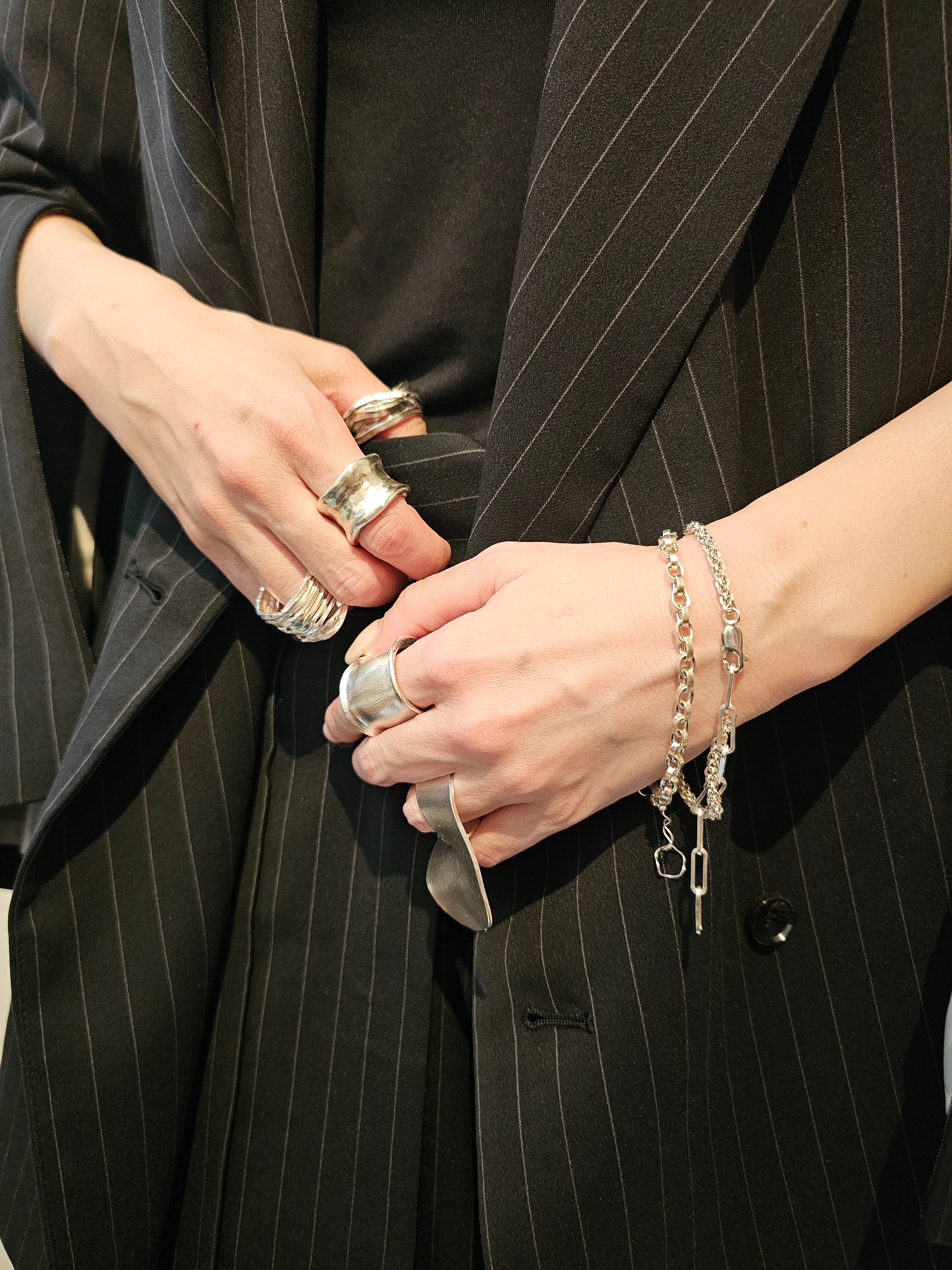 無骨な雰囲気と曲線で柔らかの印象が入り混じったデザインなので、幅広いスタイリングに合わせやすいアイテムです。